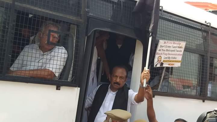 போலீசாரை கண்டித்து தர்ணா, மறியல் போராட்டத்தில் மதிமுகவினர் ஈடுபட்டுள்ளனர். கஜா புயலால் இறந்தவர்களுக்கு அனுதாபம் தெரிவிக்காதவர் மோடி. புயலால் டெல்டா மாவட்டங்கள் பெரிதும் பாதிக்கப்பட்ட போது பிரதமர் மோடி நேரில் வந்து பார்வையிடவில்லை என வைகோ கண்டனம் தெரிவித்தார்.  மேலும் நீட்தேர்வு கொண்டுவந்து தமிழர்கள் மருத்துவம் படிக்கச் முடியாமல் செய்தவர் மோடி என வைகோ குற்றம் சாட்டினார். விரைவில் பாராளுமன்ற தேர்தல் வர இருப்பதால், அரசு திட்டங்கள் என்ற பெயரில் மக்களை சந்திக்க வருவது கடும் கண்டனத்துக்குரியது. எனவே தான் பிரதமர் வருகைக்கு எதிர்ப்பு தெரிவித்து போராட்டம் நடத்துகிறோம் என மறுமலர்ச்சி திமுக பொது செயலாளர் வைகோ அவர்கள் செய்தியாளர் சந்திப்பின் போது தெரிவித்தார்…