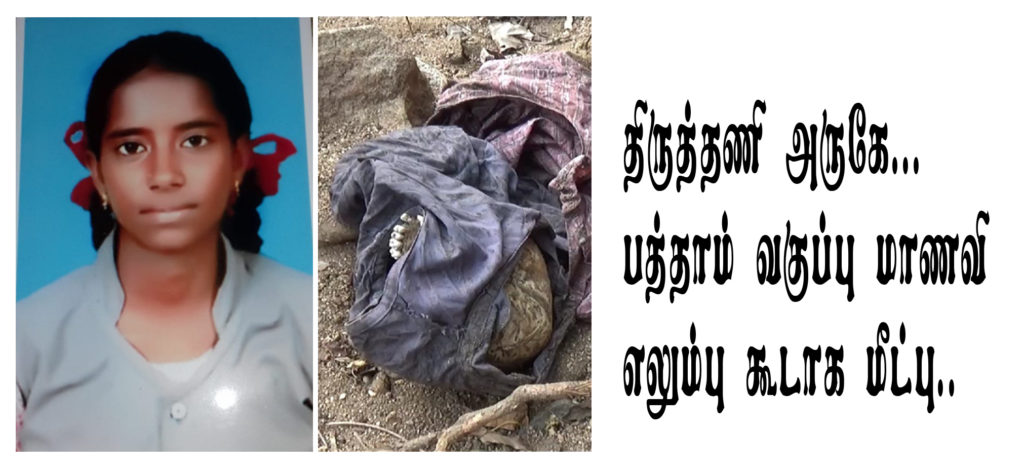 திருத்தணி அருகில் உள்ளது புது வெங்கடாபுரம் இந்த பகுதியில் சுப்பிரமணி கூலித்தொழிலாளி வசித்து வருகிறார் அவரது மகள் சரிதா வயது 15. இவர்  அருகிலுள்ள கீச்சாசலம் பகுதியில் பத்தாம் வகுப்பு தேர்வு பாடப்பிரிவில் படித்து வருகிறார்.  கடந்த வருடம் 2018ஆம் ஆண்டு செப்டம்பர் மாதம் காணாமல் போனதாக அவரது தந்தை சுப்பிரமணி பொதட்டூர்பேட்டை காவல் நிலையத்தில் புகார் கொடுத்திருந்தார். ஆனால் போலீசார் சரியாக விசாரிக்க வில்லை என்று இறந்த மாணவியின் தந்தை சுப்பிரமணி 2019 ஜனவரி மாதம் சென்னை உயர்நீதிமன்றத்தில் ஆட்கொணர்வு மனு தாக்கல் செய்திருந்தார். அதன் பிறகும் போலீசார் சரியான முறையில் விசாரணை செய்யவில்லை..