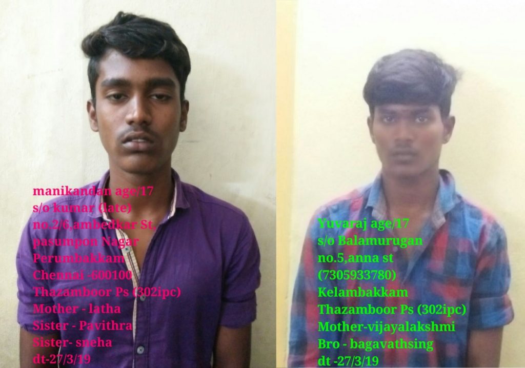 இது தொடர்பாக இந்த கொலையில் தொடர்புடைய 2 குற்றவாளிகளான சென்னை பெரும்பாக்கத்தை சேர்ந்த மணிகண்டன்/17 மற்றும் சென்னை கேளம்பாக்கத்தை சேர்ந்த யுவராஜ்/17 ஆகியவர்களை வெவ்வேறு இடங்களில் தனித்தனியே கைது செய்தனர்.