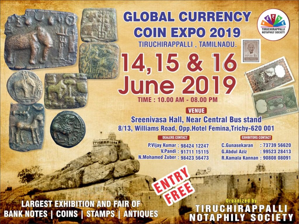 திருச்சியில் உலகப் பணத்தாள்கள் கண்காட்சி 2019 ஜீன் 14, 15,16 ஆகிய தேதிகளில் நடைபெறுகிறது.