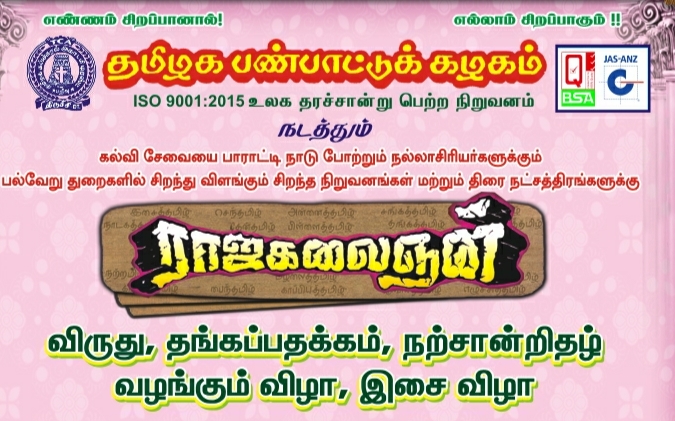 தமிழகப் பண்பாட்டுக் கழகம் சார்பில் தமிழகத்திற்கு பெருமை தேடித்தந்த தன்னலமற்ற கல்விச் சேவைக்கு மகுடமாய் அறிவுச்சுடர் ஏற்றும் நாடு போற்றும் நல்லாசிரியர்களுக்கு ராஜகலைஞன் விருது வழங்கி கௌரவிக்கும் விழா… திருச்சி தேவர் அரங்கில் ஏப்ரல் 5ஆம் தேதி நடைபெறுகிறது.