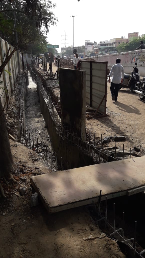 குறிப்பாக மழைநீர் கால்வாய் பணிகள் நிறைவடையும் தருவாயில் உள்ள பணிகளுக்காக கான்கிரீட் மேல்தளம் அமைத்து அதன்மீது இரும்பு கம்பிகள் அமைக்கப்பட்டுள்ளன. இக்கம்பிகளில் கான்கீரிட் கலவை போட்டு வெளியில் ஆபத்தான நிலையில் இருக்கும் கம்பிகளை மூடி நிறைவு செய்ய வேண்டும்.