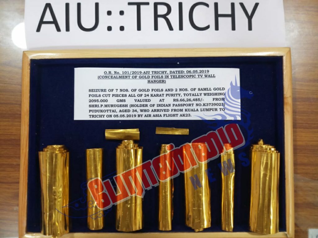 மலேசிய தலைநகர் கோலாலம்பூரில் இருந்து திருச்சி வந்த ஏர் ஏசியா விமானம் திருச்சி வந்தது. இதில் வந்த பயணிகளிடம் மத்திய வான் நுண்ணறிவு பிரிவு  அதிகாரிகள் சோதனை மேற்கொண்டனர்.  அப்போது புதுக்கோட்டையை சேர்ந்த முருகேஷ் (34) என்பவர் தான் கொண்டு வந்த டிவி  ஹேங்கரில்  ரூபாய் 66.25 லட்சம் மதிப்புள்ள 2095 கிராம் தங்கத்தை தகடு வடிவில் செய்து மறைத்து வைத்து கடத்தியது தெரியவந்தது.