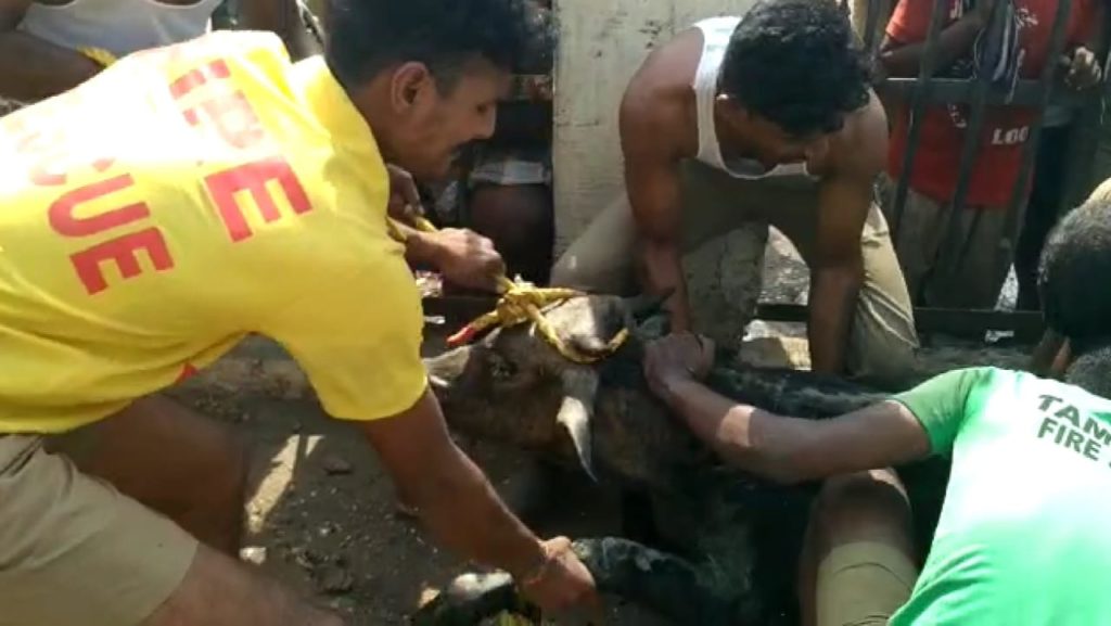 இதையடுத்து அந்த மாடு அங்கிருந்து சென்றது. நீண்ட நேரப் போராட்டத்திற்குப் பிறகு மாடு மீட்கப்பட்ட சம்பவம் அப்பகுதியில் பெரும் பரபரப்பை ஏற்படுத்தியது.