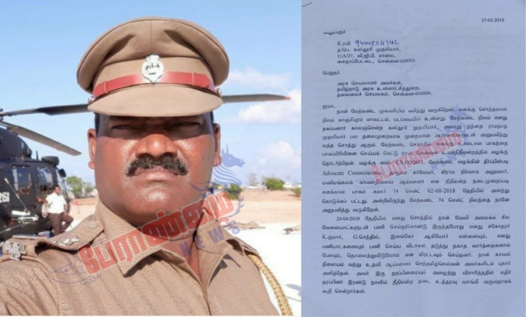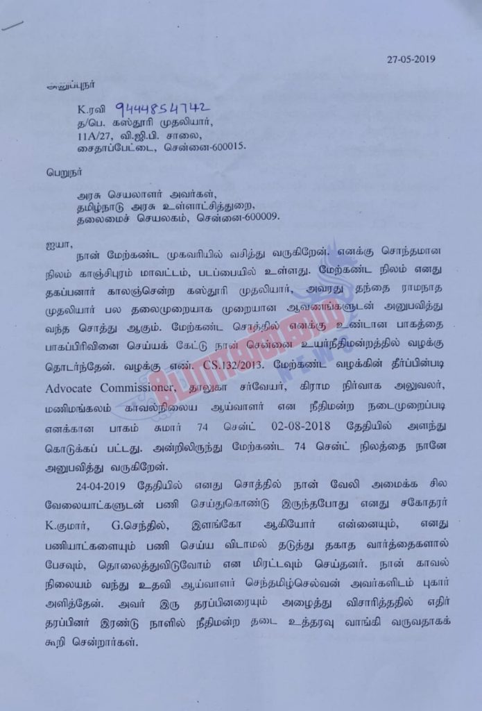 அந்த நிலத்தில் வேலி அமைக்க ரவி சென்றபோது ரவியின் சகோதரர் குமார் என்பவர்… அவரது நண்பர்களான செந்தில் மற்றும் இளங்கோ ஆகியோருடன் சேர்ந்து சண்டை போட்டு வேலையை தடுத்துள்ளனர். உடனடியாக ரவி C-3 மணிமங்கலம் காவல் நிலையத்தில் உதவி ஆய்வாளர் செந்தமிழ் செல்வனிடம் புகார் அளித்துள்ளார். புகாரை பெற்றுக் கொண்ட உதவி ஆய்வாளர் உடனடியாக நடவடிக்கை எடுக்காமல் எதிர் தரப்பினர் நீதிமன்ற தடை உத்தரவு வாங்க சென்றுள்ளதால் புகார் மனுவை கிடப்பில் போட்டுள்ளார். மீண்டும் ஏப்ரல் 29ம் தேதி நிலத்திற்கு வேலி அமைக்க சென்றவர்களை எதிர் தரப்பினர் மறுபடியும் தடுத்துள்ளனர்.