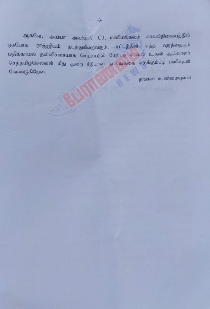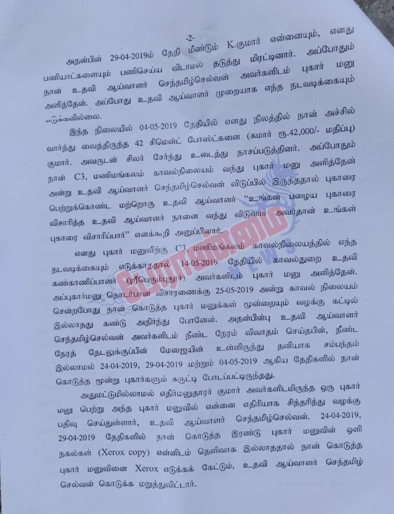 பாதிக்கப்பட்ட ரவி தான் அளித்த புகாரின் மீது இதுவரை எந்தவித நடவடிக்கை எடுக்காத மணிமங்கலம் காவல் ஆய்வாளர் ராதாகிருஷ்ணன் மற்றும் உதவி ஆய்வாளர் செந்தமிழ் செல்வன் இருவர் மீதும் உயர் அதிகாரிகளுக்கு புகார் அனுப்பியுள்ளதாக தெரிவிக்கின்றனர்…