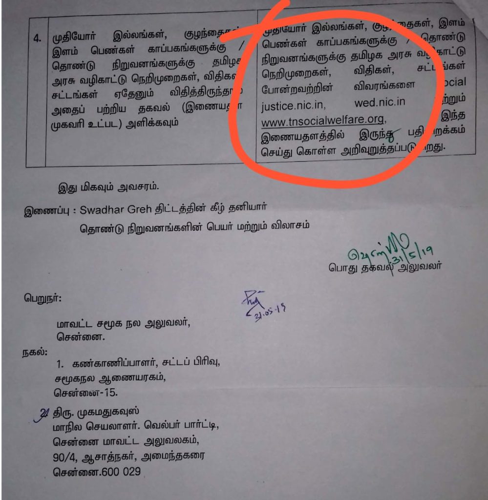 டிஜிட்டல் இந்தியாவில் அப்டேட் ஆகாத அரசுத்துறைகள். தகவல் பெறும் உரிமைச் சட்டத்தின் கீழ் தமிழகத்தில் செயல்படக்கூடிய முதியோர் இல்லங்களும், குழந்தைகள் மற்றும் இளம் பெண்கள் காப்பகங்களுக்கும் மேலும் தொண்டு நிறுவனங்களுக்கு தமிழக அரசு வழிகாட்டு நெறிமுறை விதிப்படி சட்டங்கள் ஏதேனும் விதித்து இருந்தால்.? தகவல் பெறும் உரிமை சட்டம் 2005 ன் படி விளக்கம் அளிக்கும்படி கேட்டதற்கு.. நமக்கு சமூக நல ஆணையரகம் தந்த பதில் கடிதத்தில் (www.tnsocialwelfare.org) இந்த இணையதளத்தில் இருந்து பதிவிறக்கம் செய்து கொள்ள வேண்டும் என்று அறிவுறுத்தப்படுகிறது.என்று விளக்கம் அளித்துள்ளனர்.
