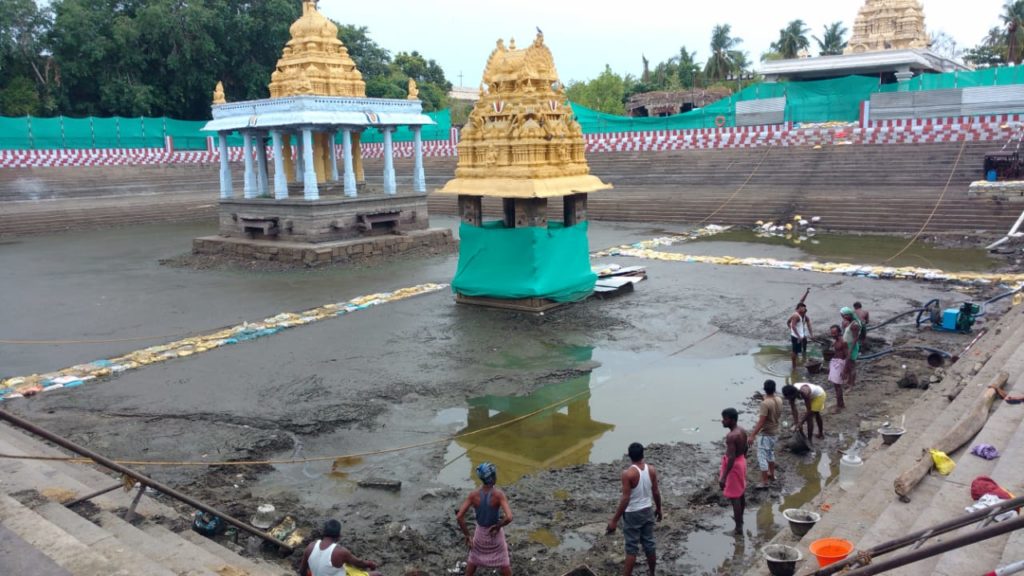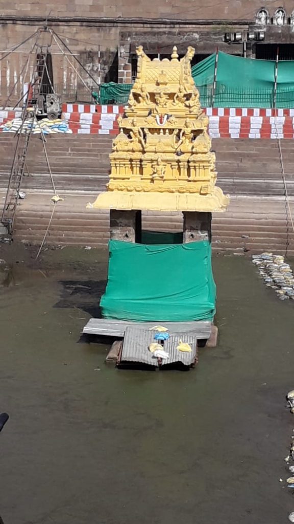 பெருமாள் பெரும் உஷ்ணத்தைத் தணிக்கவே தெப்பக் குளத்தில் வாசம் செய்கிறாராம். அப்படியே இவரை வெள்ளித் தகடு பதித்த பெட்டியில்… சயனக் கோலத்தில் வைத்து ஆனந்த புஷ்கரணி மண்டபத்தின் நடுவே நீரில் வைத்து விட்டனர். பழைய சீவர பெருமாளை தேவராஜப் பெருமாள் என பிரதிஷ்டை செய்து விட்டனர்.