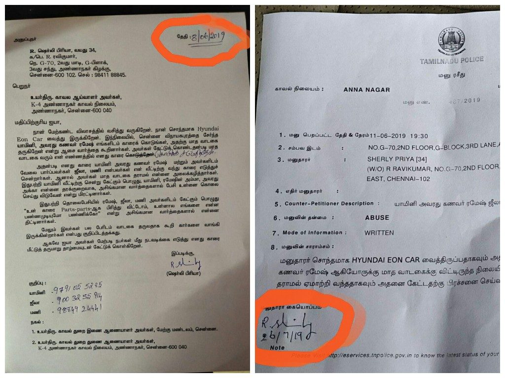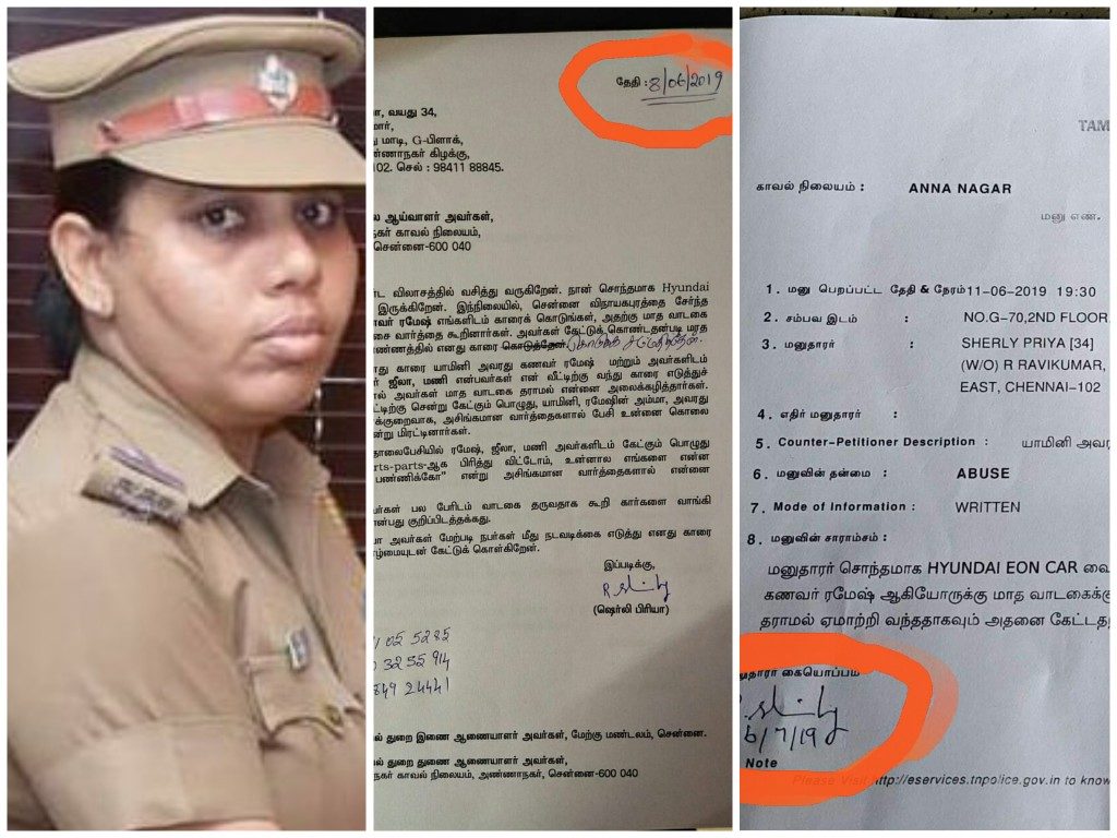 இவர்களுக்கு பழக்கமான கொளத்தூர் பகுதியை சேர்ந்த யாமினி என்பவர் இவரை தொடர்பு கொண்டு அவரும், அவரது கணவர் ரமேஷும், சினிமா ஷூட்டிங் போன்ற நிகழ்ச்சிகளுக்கு காரை வாடகை விடுவதாகவும், உங்களுடைய காரை கொடுத்தால் அதற்கு மாத வாடகை தருவதாக கூறினார். வாடகை கிடைக்கும் என்ற எண்ணத்தில் காரை தந்துள்ளனர். பல நாட்கள் ஆகியும் யாமினி மற்றும் அவரது கணவர் ரமேஷிம் காருக்கு உண்டான வாடகை எதுவும் தராமல் ஏமாற்றி வந்ததும் பிறகு போனில் தொடர்பு கொண்டு ஷெர்லி ப்ரியா கேட்டப்பொழுது யாமினியின் கணவர் ரமேஷ் காரை கொடுக்க முடியாது உன்னால் என்ன செய்ய முடியுமோ செய்து கொள் என்று அவதூறான வார்த்தைகளால் திட்டி, கொலை மிரட்டல் விடுத்ததால் மனவேதனை அடைந்த ஷெர்லி பிரியா அண்ணா நகர் காவல் நிலையத்தில் தனது கணவர் ரவிகுமாருடன் சென்று 08/06/19 அன்று புகார் அளித்துள்ளார்.