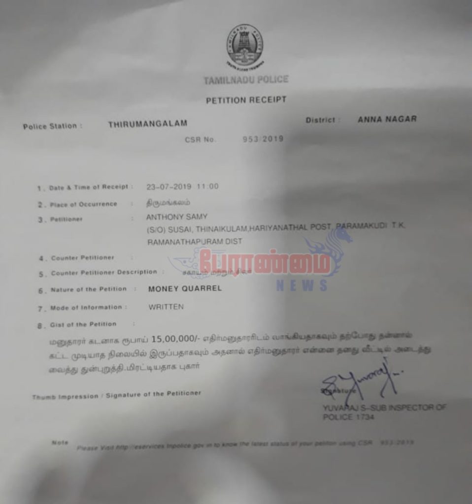 அதைத்தொடர்ந்து திருமங்கலம் போலீசார் விசாரணை நடத்தியதில்… இன்று அந்தோணிசாமி என்பவர் திருமங்கலம் காவல் நிலையம் வந்தபோது தன்னை கடத்தியதாக கூறப்பட்ட சகாயமும் அங்கு இருந்ததால் இருவருக்கும் வாக்குவாதம் ஏற்பட்டது. பாதிக்கப்பட்ட எனது புகாரை ஆய்வாளர் முறையாக விசாரிக்க வேண்டும் என்றும் என்னை கடத்தியவர் இவர் மீது உடனடியாக நடவடிக்கை எடுக்கும் படி அந்தோணிசாமி கூறிவருகிறார்.