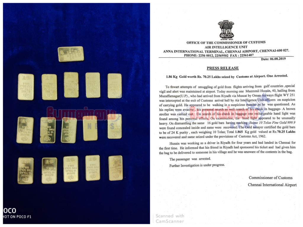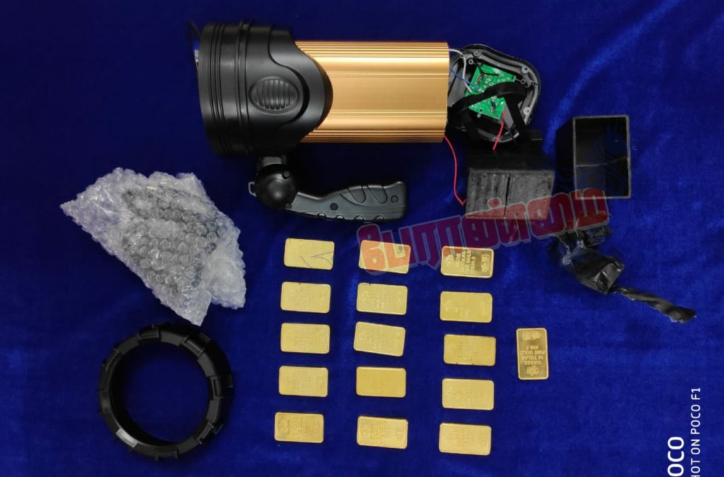 சென்னை விமான நிலையத்தில் வெளி நாடுகளில் இருந்து வரும் விமானங்களில் கடத்தல் பொருட்கள் வருவதாக சுங்கத்துறை அதிகாரிகளுக்கு கிடைத்த தகவலின்படி தீவிர கண்காணிப்பில் ஈடுபட்ட சுங்கத்துறை அதிகாரிகள், நேற்று 06 ஆம் தேதி காலை வழக்கம் போல் வெளிநாடுகளில் இருந்து விமானத்தில் வரும் பயணிகளின் பொருட்களை சோதனை ஈடுபட்டு இருந்த போது, உத்திர பிரதேசம் மாநிலத்தை சேர்ந்த முஸ்மில் ஹூசேன் (40) என்பவர் ரியாத் இல் இருந்து மஸ்கட் வழியே சென்னை வந்தடைந்தார். முஸ்மில் ஹூசேனிடம் சந்தேகத்தின் பேரில் விசாரணையில் ஈடுபட்ட சுங்கத்துறை அதிகாரிகளிடம் அவர் முன்னுக்கு பின் முரணாக பதில் அளித்ததால் ஹூசேன் எடுத்து வந்த சூட்கேஸை சோதனை செய்ததில் அதில் Rechargeable Hand Light அதிக எடைகொண்டு இருந்ததால் அதை பிரித்து பார்த்ததில் சுமார் 16 தங்க கட்டிகள் இருந்ததை உறுதி செய்த அதிகாரிகள் அவற்றை பறிமுதல் செய்தனர். முழுமையான விசாரணைக்கு பின் ஹூசேன் ரியாத்தில் கார் டிரைவராக பணிபுரிந்து வந்ததாகவும் முதன் முறையாக தான் சென்னை வந்துள்ளதாகவும் கூறினார், மேலும் அவரது நண்பர் தான் விமான டிக்கெட் தனக்கு எடுத்து தந்து சென்னையில் அவரது நண்பரின் வீட்டில் இந்த சூட்கேஸை ஒப்படைக்க சொன்னதாகவும் அந்த சூட்கேஸில் என்ன இருக்கிறது என்பது தனக்கு தெரியாது எனறும் ஹூசேன் கூறியதாக சுங்கத் துறை அதிகாரிகள் ஹூசேனை கைது செய்தனர்.