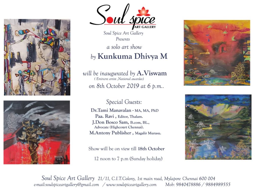 குங்கும திவ்யா என்ற ஓவியகலை வள்ளுநர் தனது சொந்த முயற்சியில் சென்னையில் ஓவிய கண்காட்சி திறந்துள்ளார். கடந்த அக்டோபர் மாதம் 8ம் தேதி துவங்கிய இக்கண்காட்சி வரும் 18ம் தேதி வரை நடைபெறுகிறது.