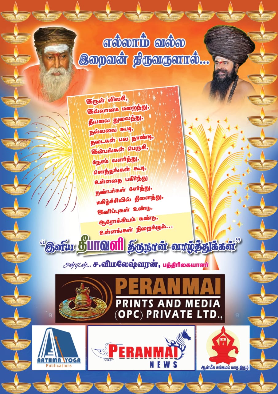 ஆன்மிகம் முகப்பு இனிய தீபாவளி நல்வாழ்த்துகள் | 6 years ago Murali K See author's posts Continue Reading Previous பிகில் படத்தை பார்க்க பதிவு செய்யாத வாகனத்தை 120km வேகத்தில் ஓட்டி | குழந்தை பலி |Next தருமபுர ஆதீனம் இளைய சந்நிதானம் ஸ்ரீலஸ்ரீ மாசிலாமணி தேசிக ஞானசம்பந்த பரமாசாரிய சுவாமிகள் அருளாசி |