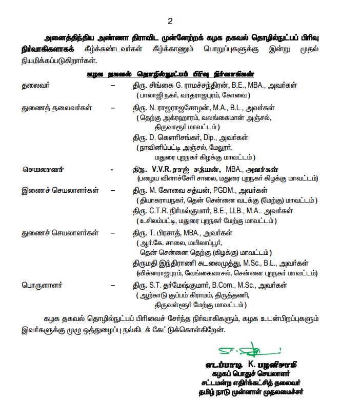 பிரிவின் தலைவராக சிங்கை ஜி.ராமச்சந்திரன், இணை செயலாளர்களாக கோவை சத்யன், சி.டி.ஆர்.நிர்மல்குமாரும், துணைத்தலைவர்களாக வலங்கைமான் என்.ராஜராஜசோழன், மேலூர் டி.கௌரிசங்கரும் நியமனம் செய்யப்பட்டுள்ளனர்.