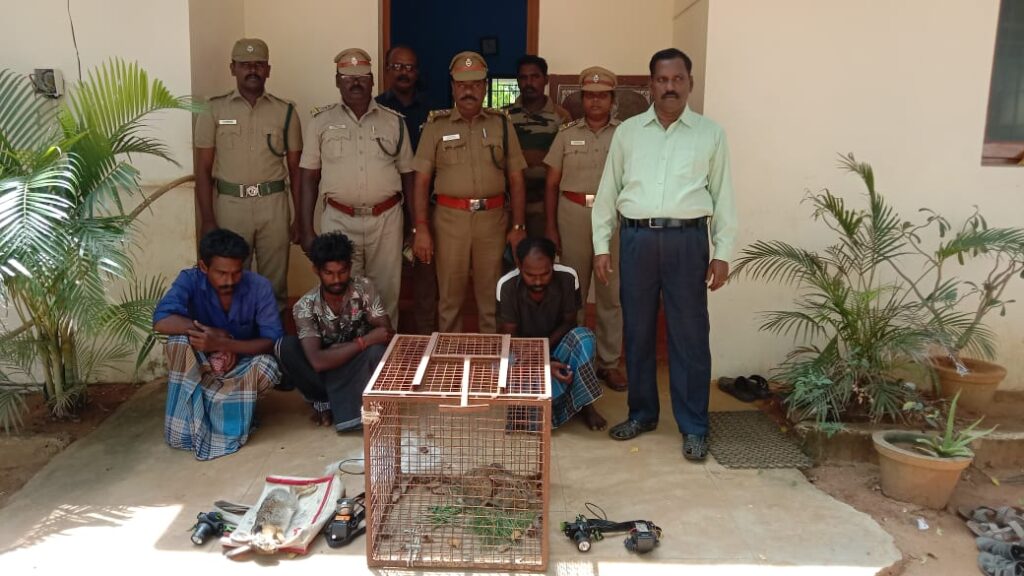 முயல்களை வேட்டையாடிய வாராப்பூர் கிராமத்தினை சார்ந்த அருண்,வீரபாண்டியன், உருமைய்யா ஆகிய மூன்று பேரையும் வனப்பணியாளர் சுற்றி வளைத்து பிடித்தனர்.