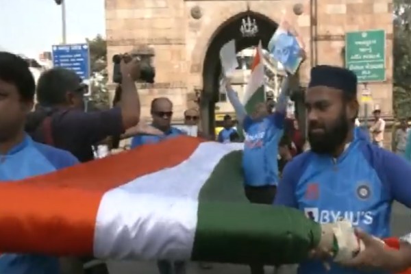 குஜராத்தின் அகமதாபாத்தில் உள்ள கிரிக்கெட் ரசிகர்கள் நாளை நவம்பர் 19 அன்று ஆஸ்திரேலியாவுக்கு எதிரான இறுதிப் போட்டிக்கு முன்னதாக உலகக் கோப்பை கோப்பையின் சின்ன வடிவத்துடன் 500 அடி நீள மூவர்ணக் கொடியை ஏந்திச் செல்கின்றனர்.